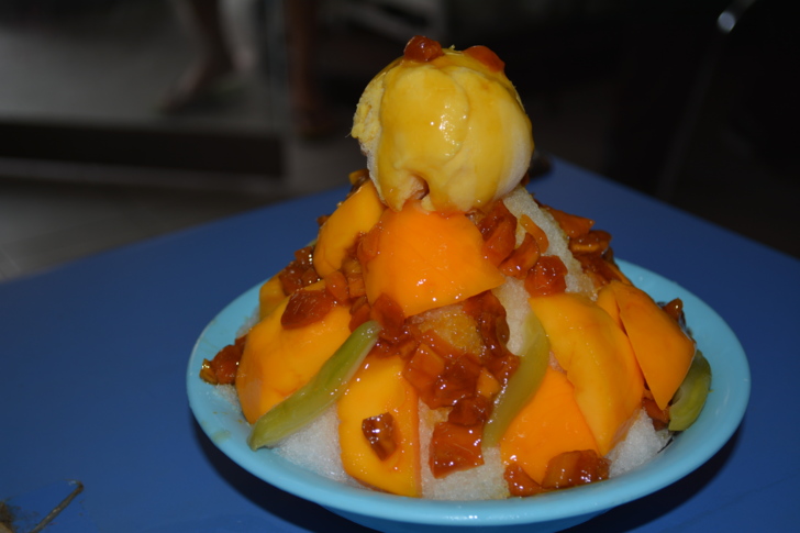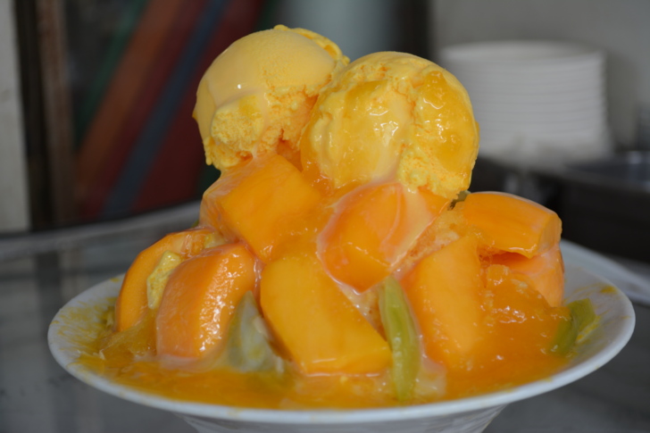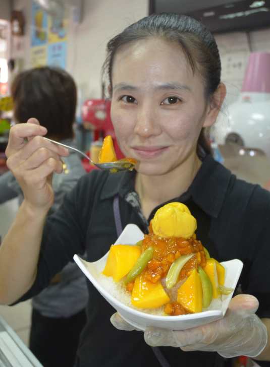 炎炎夏日吃一碗愛文芒果冰,是一大享受。台南市玉井有間冰舖推出一道帶有龍眼柴燒香味的「果釀愛文芒果冰」,以蒸乾的芒果乾熬製成果釀,淋在滿滿的愛文芒果上,帶有酸甜滋味,清爽不膩。 還有該店招牌的「芒果無雙」,一碗可吃到土芒果、金煌及愛文芒果3種不同芒果的滋味,都是必吃選擇。 「果釀愛文芒果冰」是該店獨家專賣,「果釀」口感相當特別,早年山區阿嬤們以龍眼柴燒水時,在鍋蓋鋪上芒果蒸掉水分而成,加糖熬煮成為「果釀」,與芒果冰搭配一起吃入嘴裡,散發出一股淡淡的龍眼清香,比起一般芒果冰的口感、香味更為獨特。 該店招牌「芒果無雙」特色在於冰底「芒果冰磚」,使用土芒果、愛文及金煌的果肉製成,上面再鋪滿新鮮愛文芒果、情人果,再淋上芒果果泥、放上一球自製冰淇淋,不加糖水,滿口都是芒果的鮮甜美味。(記者吳淑玲) ▲怎麼去 有間冰舖玉井本店 地址:台南市玉井區中正路152號 電話:(06)5747130 |