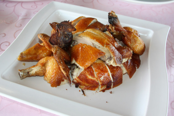 知名「黃金脆皮雞」料理,口味獨特,肉質甜美名。呂鶯嬌說,製作手法繁複,雞肉得先用滾水燙過,再浸泡20多種特調中藥4小時,晾乾後再烤1小時以上,上桌前再淋油汁,肉質鮮美,全雞800元、半雞400元。