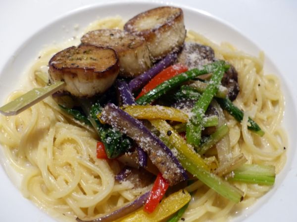 黃金干貝白醬義大利麵令人難忘 招牌現打的精力湯 店用所有食材全展示在玻璃櫃內 每一樣食材都經過炒、熬、煨等處理過