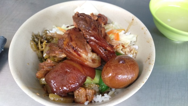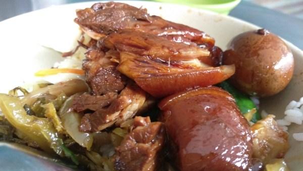 招牌豬腳飯用碗公裝盛,白飯鋪滿小黃瓜、酸菜、滷蛋等配菜,再疊上數塊豬腳肉,淋上滷汁,鹹中帶甜,可以連扒好幾口飯,豬腳皮又Q又軟嫩,也不易覺得膩口,一張百鈔就可以吃得很飽。