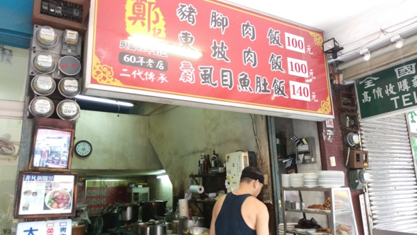 鄭記豬腳飯位於古蹟撫臺街洋樓旁,豬腳肉飯、東坡肉飯、虱目魚肚飯都很受好評,店面不大,但無論何時去都坐滿人;點餐時,可看到鍋裡的陳年老滷,將鍋子邊緣浸得焦黑,一塊塊控肉與豬腳在鍋中滷得焦甜,令人垂涎三尺。