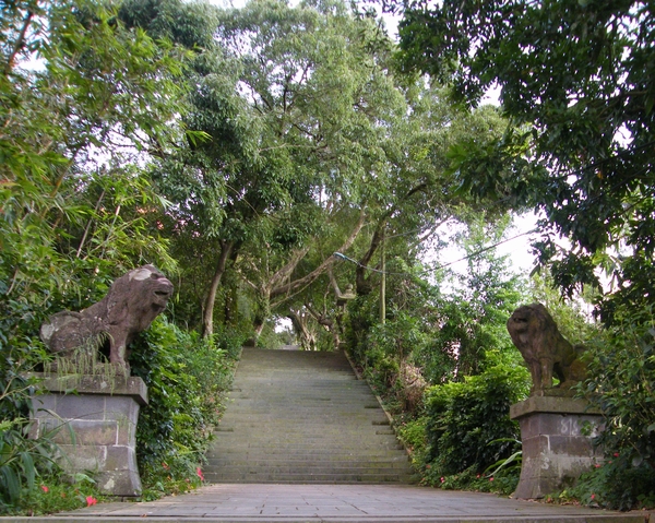 從入口牌坊處拾級而上,可見寬闊潔淨的石階,兩旁皆有信徒奉獻的石獅與煤油石燈籠,捐獻者來自日本及台灣兩地,底座刻有「神戶市」、「文山郡」、「永樂町」等當時行政區域地名。