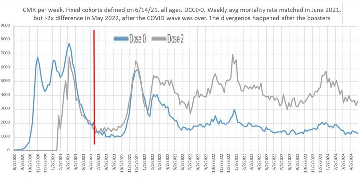來自捷克 1,100 萬人數據的圖表 (2020-2024 年每周死亡率) 藍線為未接種者,灰線為接種兩劑者。 從 2021 年底加強針推廣後,灰線上升, 尤其 2022 年 5 月疫情波結束後, 接種者死亡率是未接種者的 2 倍。 這證明疫苗增加全因死亡率,主流醫學在隱瞞真相。 捷克數據更值得審視, 因為它是原始登記記錄,可供獨立驗證, 不像 CDC 的輸出充滿選擇性發布和事後調整,就是詐騙。 |