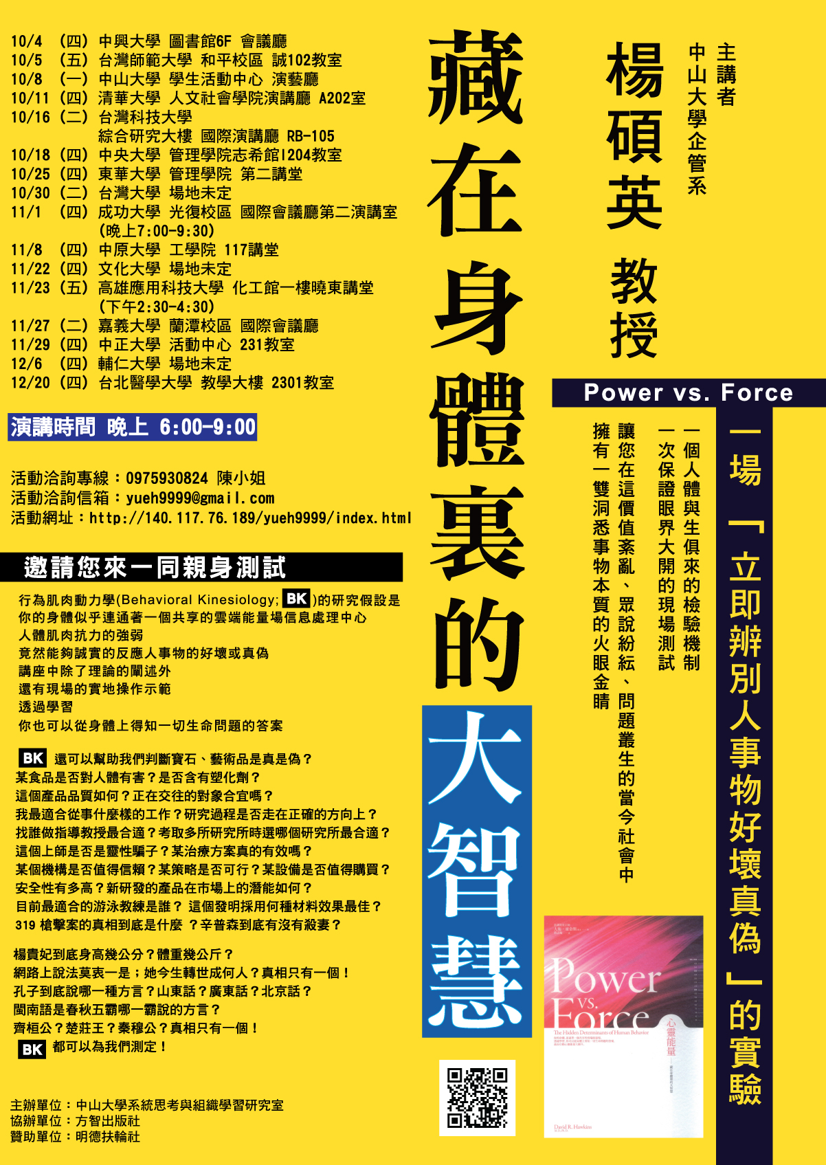 Power VS. Force: The Hidden Determinants of Human Behavior 大衛霍金斯 David R. Hawkins, M. D., Ph. D. ◎ 肌肉測試的全方位應用 爲了突顯本技巧作為研究工具的價值,本書提供各種人類活動的潛在應用範例,例如在純理論上的藝術、歷史、商業、政治、醫藥、社會學及自然科學等;在實用領域上的行銷、廣告、研發等;在經驗領域上的心理、哲學及宗教探索。 此外,也在多元的犯罪學、情報工作、上癮研究及自我成長領域提出特定的應用方式。 而事實上,最究竟的選擇是選擇與高能量吸引子場域或低能量場域共鳴。 讓政府、社會運動及整個文明垮台的虛弱吸引子模式,也一樣會不斷毀掉公司或個人的職業生涯。一個人必須選擇,然後為其後果負責。 無論在產品、公司或員工方面,都極易測定其吸引子能量場。 在我們的研究裡,失敗事業與成功事業的差異已證明十分顯著,因此優異的預測準確度是可預期的。 人們總是會被外在的光鮮亮麗所迷惑,就像買入白銀的天真投資人,最後發現整個白銀市場都受到了操弄。 美國惡名昭彰的「儲貸危機」及其始作俑者,也可以早在醜聞爆發前就被指認出來。 僅僅藉由檢視一個事業體的作為是與高的或低的吸引子模式共鳴,就能避免類似的災難發生。 一旦了解商業上外力與心靈力的不同運作方式,幾乎光憑直覺就能識別兩者的不同。 他內在所構想的 ABC 形成了外在因果的 A→B→C:一個成長迅速的沃爾瑪巨人。 相反地,沃爾瑪的員工皆被訓練為樂於助人、親切,而且精力充沛——這在工作場所反映出一種人道的能量場。 他們的工作變得有意義、有價值,因為他們與「服務」共鳴,致力於支持生命與人類的價值。 所有的沃爾瑪百貨都設有一個專區,讓你能停下來歇歇腳,並做出更好的採購決定——這種爲了因應簡單的人性需求而做的空間分配,就每平方英尺的銷售總額而言,恐怕永遠無法通過科學化的管理計算。 然而這些「效率」專家所忽略的是人性化的同理心,以及數百萬顧客的市場忠誠度。 電腦不會感覺,如果人們了解「感覺將決定是否購買」這一事實,就會更加注意感覺這件事。 一些模仿沃爾瑪百貨部分特色,希望能重新奪回市占率的公司都無法成功,因為他們只是模仿了外在因果 A→B→C,而非與那些特色的內在來源 ABC 產生共鳴。 作者下結論道,成功的公司就是那些擁有「一顆心」的公司,和那些嚴格左腦取向、科學化管理的公司不一樣。閱讀這份資料,會讓人對許多市場調查過程的不足感到震驚:那些統計學家根本不知道該問什麼問題。 因為正直與卓越是與心靈力產生共鳴的,它們本身就是活廣告。 利用我們所說的簡單肌肉動力學技巧,就能立刻顯示一個行銷計畫或電視廣告是強還是弱。 一個讓人變強的廣告會引發對產品的正面感受。 同理,在讓觀眾變弱的電視節目購買廣告時段的廣告業主,也會發現他們的產品被無意識地與這些負面感覺聯想在一起。 藉著詳細分析廣告,我們可以確立那些讓人變弱、產生負面效果的因素——播報員的聲音、演員的格調,或者某些詞彙、觀念或象徵的使用等。 一些不斷製作品味低級、甚或令人尷尬的廣告的公司,反映出他們廣告行銷部門的吸引子能量場普遍低落。