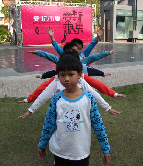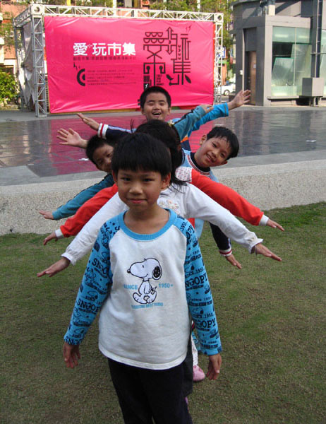 情人節的午後 午後的陽光燦燦、微風徐徐怡人的氣候,帶著孩子至文化中心參觀畫展及野餐。一群美少女躲進肯德基吹冷氣聊八卦,只好陪著二年級的孩子享受戶外的自然風。 一會兒學生嘰嘰喳喳的跑來告訴我,唉唷!老師我們後面有一個男生抱著一個女生在親親喔!我早就察覺到了,一對大約是國高中的學生吧!我以為我們一群人在那兒,他們會識趣的離開,到別處隱密一點的地方去,哪知現在的年輕孩子這麼大膽,光天化日下也要向眾人,展示他們熱情的慶祝情人節。直到我們離開他們都還不走,原來他們還等著共度看夕陽囉! 下圖:千手觀音變千頭觀音了囉~~