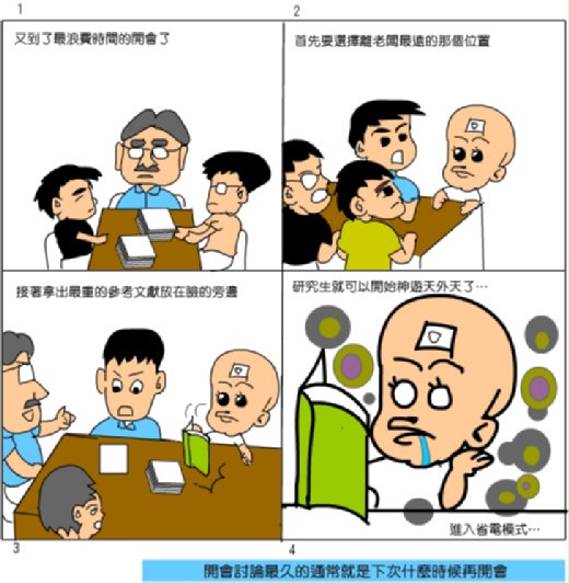 明明可以各別約研究生一對一單獨對談的事,也喜歡把大家叫起來一起大眼瞪小 眼,如果是有事情要一次向大家宣佈就無可厚非,但要是每次都把一堆人叫來, 然後一一檢討,那真的是很泿費大家的時間。 有的研究生認為,其實只要老闆稍微跟的上時代一點,利用msn把要交待的事 ,在網路上快速交待完畢就好,有什麼需要老闆看的稿子,也直接透過msn來 討論檢討即可,何必每次都要勞師動眾,叫一堆學生大老遠的從各地趕來,然 後還慢慢的一對一交談,實在是很浪費時間。 話說回來,有的學生也很怕老闆學會這些工具,因為一旦學會了,緊迫釘人的 壓力與時間緊迫性將更為嚇人,只是,如果該來的悲劇還是要來,還不如讓它 早一點來,學生也才來得及畢業,不是嗎? 說起來也奇怪,許多老闆連打字與用msn都懶得學,卻還可以跟學生談時間管理 ,感覺就覺得很諷刺,其實這些工具如果好好利用,比學英文的邊際效用還要大 ,老闆們當然可以說,資料只要請學生打就好了。學生打字的速度也都很快,不 過事實証明,許多事能夠自已做,效率還是最好的。 如果老闆能夠自在的透過網路工具來與學生作文字上的溝通與事務上的交流,將 可以大量節省許多不必要時間成本的浪費,有句話說的好,「只見秋毫,不見輿薪」 ,老闆常常叫學生做好時間管理,要在限定的時間範圍內把東西做好,交出報告,但 自己又常常耽誤學生的時間,感覺就非常諷刺。 從這一點來看,學習打字與利用網路搜尋的技巧,似乎比學會一些日後用不到的專業理 論,還更有邊際效用哩。 研究所的會議由於常常是一個老闆叫許多學生來一一作報告與檢討,如果學生的 人數夠多,輪到自己的時候,時間都己過大半了,而且有時候研究室的開會重點,常常是 在討論下一次開會時要吃什麼?以及下次開會的時間?,不重要的事討論的比重要的事還久 就是開會最大的原罪啊:,這個時候,聰明的研究生就應該要學會使用研究生出神大法 才能保証自己不會在研究所期間被智障開會流程給搞笨。 當然,這是有程序的,一切都要照作業標準程序(SOP)來作,才不會倒大楣… 首先,一定要先選一個老闆最不容易看到的位置坐好,坐好之後,準備進入省電模式, 進入省電模式之前,要先設定快速反應台詞,以免突然被叫到,熊熊反應不過來,較 經典的台詞如下:「依照老師剛剛講過的理論,我覺得值得深入去探討」「剛才同學 所提出的意見,我覺得蠻好的,不過我認為,還有討論的必要」這是一種好像有聽進 去,但實際上什麼都不知道的萬用性台詞,僅供參考。 進入省電模式後,為了避免自己在大庭廣眾之下,當眾打呼,最好在事先先設定一些開 會時要思考的東西,例如目前研究的問題,下次聯誼的行程安排,晚上的團康活動等等 ,研究生很奇怪,當自己有空的時候,都不會關心研究進度,而通常在MEETING的前一 天,才會想到好像老闆交待的事都還沒做,利用開會的時候來思考研究上的難題該怎麼 克服,團長覺得倒是不錯的方法,反正時間也都浪費了,就應該浪費在值得浪費的事物 上,例如研究,呵呵… 許多同學也會利用開會時間培養第二專長,例如素描,開會前先準備一張紙與鉛筆,坐 在老闆的對面,認真的盯著老闆口沫橫飛的表情,一筆一筆描繪出自己心中對老闆有如 滔滔不絕江水般的景仰,經過長時間的磨練之後,自然可以成為當代的素描高手。 有的研究生則是利用開會時發展出最新的五子棋走法,也有的研究生思考出今日晚餐的菜 色,這種一個時候作多樣事情,一個表情作多種動作,一個頭腦作多層次思考的分時多工 技術,在這個競競激烈的現代社會,日後一定是要掌握的技術,既然日後一定要學,早學 晚學也一定要學,就利用無意義研究室開會的這段時間,好好的學會這套出神大法吧。 最後要切記,入定前要先設定出定的時間,否則大家都走了,你一個人還留在現場出神 那就非常好笑了…。 (以個人開會多年來的心得,發現開會真的是一件沒有效率的事,重要的會議其實 如果主持人掌握的好,一二個小時就可以開完,得到決議,常常有那種動不動要開五 六個小時的會議,真的非常浪費大家的時間,而且還會給研究生一種錯覺,好像自己 做完了什麼重要的任務,既然重要的開會任務己經完成,接下來要幹嘛,就打電動囉。) |