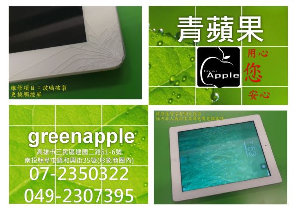 南投/草屯/彰化/高雄/台南/屏東包膜最佳推薦青蘋果greenapple - 各式3C產品包膜、螢幕保護貼、手機包膜、防指紋保護貼、9H疏水疏油螢幕保護膜(鋼化膜)、抗藍光膜、授權原版kitty保護膜、授權原版海賊王保護膜、授權原版迪士尼保護膜、 高雄/屏東/台南/南投/草屯/台中/竹山/埔里/水里/員林 高價收購中古二手手機-收購二手中古相機-收購電記型電腦i3.i5.i7筆電/收購二手單眼相機-收購全新二手平板電腦-收購禮券(家樂福.SOGO.新光三越.漢神巨蛋)-收購全新二手各式3C產品 青蘋果維修手機平板基本維修流程 聽筒:對方講話您聽不到亦是有雜音雜訊。 話筒:您講話對方聽不到亦是有雜音雜訊。 按鍵:鍵盤其中一鍵或多個按鍵無反應,通常出現在home鍵.音量鍵。 液晶:撞到亦摔到畫面黑黑的無法辨識或是出現多色紋路。 觸控:撞到亦摔到玻璃表面裂痕或破裂導致觸控不靈敏或無反應。 訊號:訊號時好時壞或完全無訊號,有訊號但無法撥打進來。 耗電:待機時間變短,有時候使用會直接關機。 響鈴:手機無鈴聲或鈴聲破音.雜訊。 震動:設定震動來電卻無震動,此為震動馬達故障。 青蘋果維修項目 機殼損壞更換 螢幕摔壞更換 維修後的手機我們也會基本的功能測試觸屏是否順暢其他功能是否正常無誤 最後開立保固卡 保固期90天非人為因素損壞皆更換新零件 青蘋果高雄店:高雄市三民區建國二路 51-6號 預約來電:07-2350322 0925-266600 青蘋果南投草屯店:南投縣草屯鎮和興街35號(形象商圈內) 預約來電:049-2307395 0980-367580 |