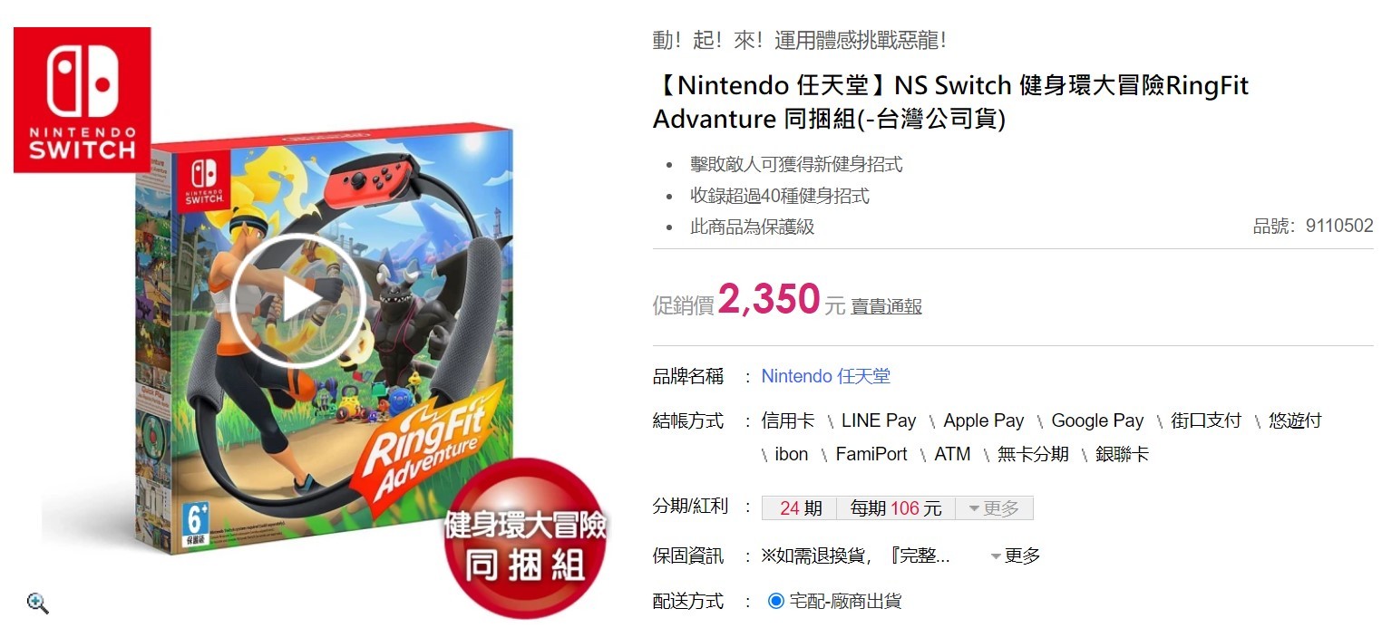 【Nintendo 任天堂】NS Switch 健身環大冒險RingFit Advanture 同捆組(-台灣公司貨)