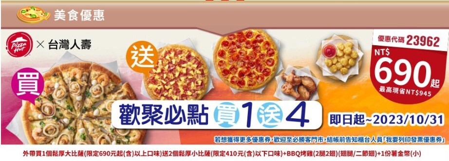 台灣人壽x必勝客推出歡聚必點買1送4~2023/10/31止 網址由此進:https://www.taiwanlife.com/activity/activity/127?CMP_SRC=EDM_CRM_202309