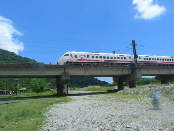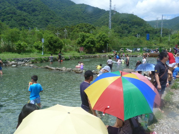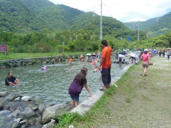 車子繼續載著我們到係個目的地「東岳冷泉」,一眼望去以為來到廢墟,門口 的招牌已不知遺落何方,售票口也斑駁頹廢,園區內雜草叢生、垃圾四散,只 見遊客都聚集在花東鐵道橫越的腳下一方池塘,原來這池清澈的池水就是有名 的東岳冷泉,在如此酷熱的天氣,泡泡池水的確有股清涼透徹直達心裡,只是 偶而的火車從天際掠過,有些兒破壞情調。因為到此消暑的遊客太多,我們也 就停留一會便繼續後頭的行程。