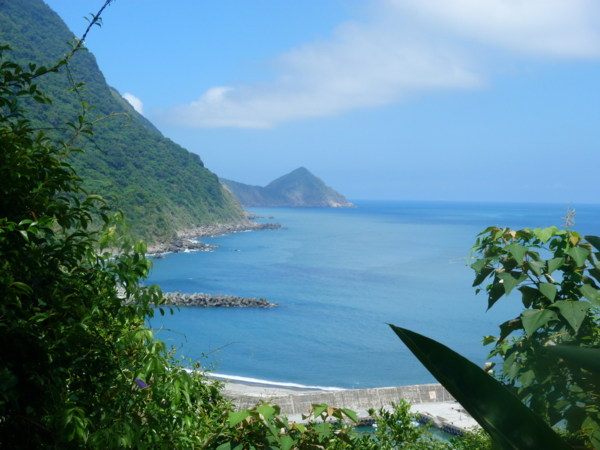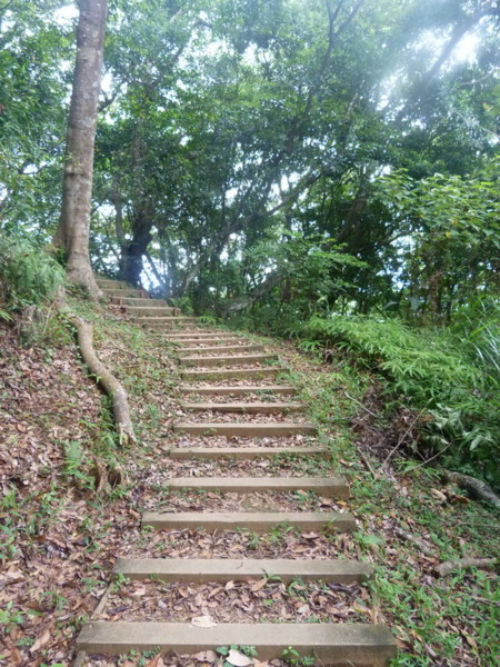 終於要開始走路登高了,我們沿著國家步道的入口-豎有原木製成的招牌, 踏著平整的枕木階梯,一步一步往上爬,我的右手邊遠處是中央山脈,左手 邊便是浩瀚的太平洋。步步登高還是感到有些吃力,而今天竟然沒有一絲風 吹來,才一會兒功夫就汗流浹背了。好不容易爬到了一處觀景平台,總算可 以喘口氣,從這放眼望去,湛藍的海水圍繞著翠綠的海岸線,與無雲的藍天 交疊,形成一幅美不勝收的畫作,看著眼前的美麗景色,剛才爬坡的辛勞便 已忘卻。體力恢復了,便繼續攻頂。
