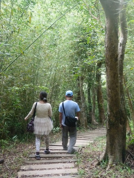不消一會兒功夫就到了步道的制高點,與朋友在此拍照嬉鬧後,便往山下行。 有謂上山容易下山難,這時候才能體會話中真意。由於落後同車友人太多,所 以只顧著趕緊下山,已無暇關照四周景致。很快的就到達出口,我們在山下的 朝陽社區逛了逛,感染一下鄉間的閒適與鄉民的質樸。