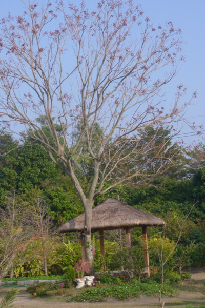 我們先逛了逛休閒農場的大致範圍,沒想到它還有養雞場、豬舍、菜圃,和一座 溫室,還有一處不小的後花園,花園中還蓋了一座南洋風的小涼亭。園內處處可看到 花兒盛開的景象,看起來著實很像休閒農場。