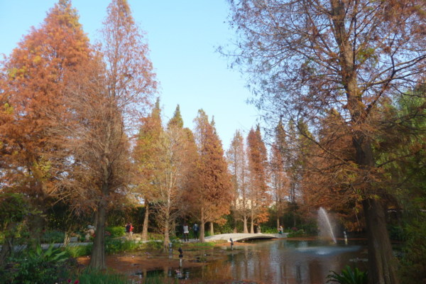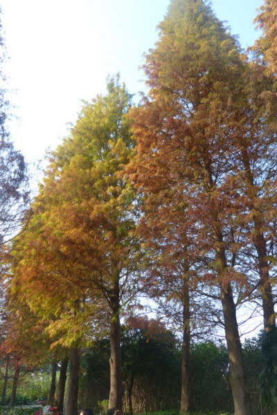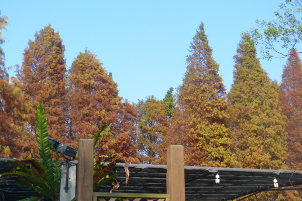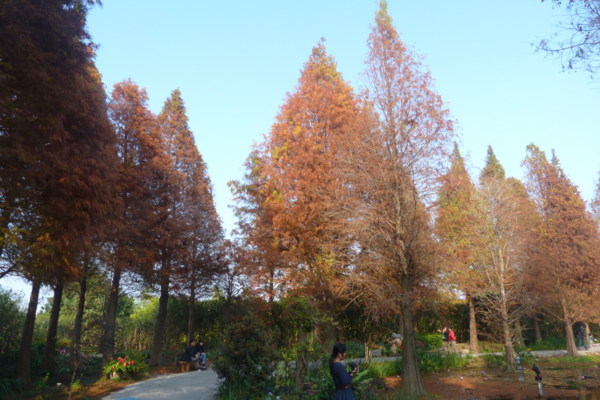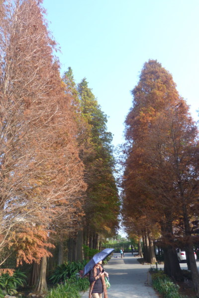 迎接我們的是一整排高大筆直的落羽松,以其多彩而溫暖的顏色,吸引我的眼光 ,如此美景好像只在風景明信片或海報中見過,現卻活生生呈現在我眼前,令我有種 身在異國的錯覺。