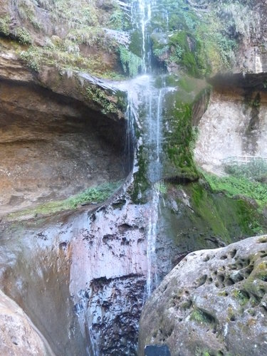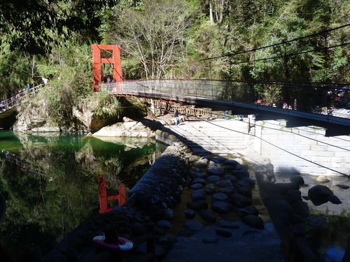 專車在林間穿梭,不消片刻便到了終點。下了車遠遠便看見山頭上掛著一縷瀑布,山谷的水清澈見底,卻見不到魚蝦。一座紅色吊橋跨在兩座山頭間。沿著梯街走過一處山凹處,天然形成的景觀,真是鬼斧神工。