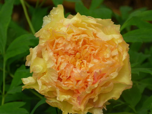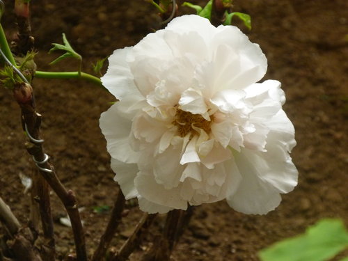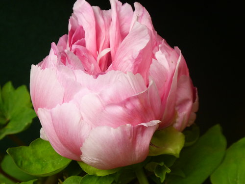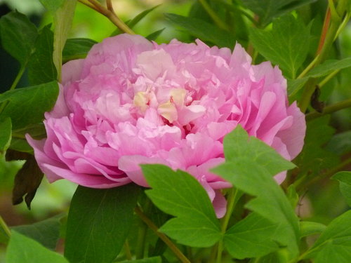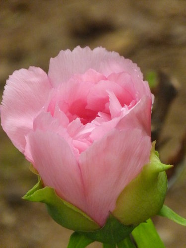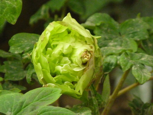 胡紅,花蕾頂部有時開裂,花粉紅色,內瓣質軟曲皺,排列隆起呈球形。