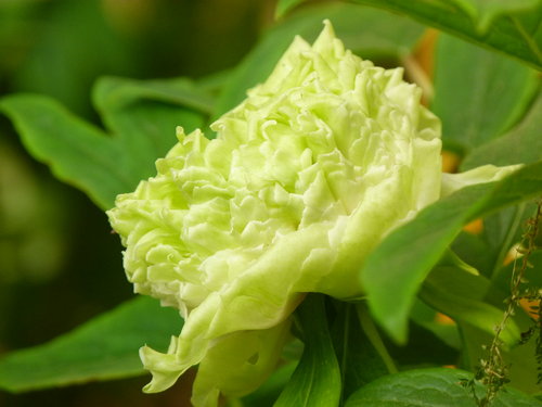 綠幕隱玉,花初開淺綠色,盛開白色,雄蕊全部瓣化,雌蕊瓣化成綠色彩瓣。