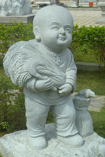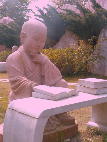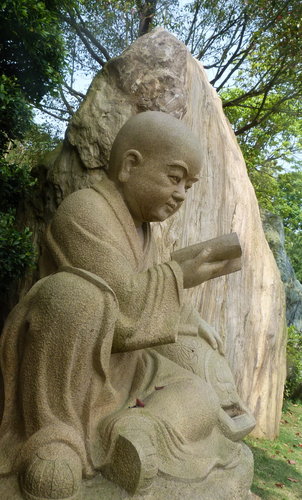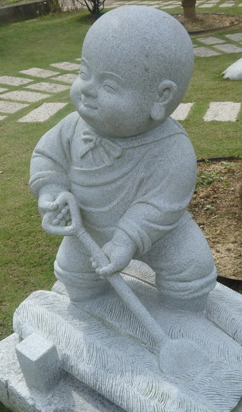 倚著山勢,另有一片石雕小公園,園中各式表情生動的小沙彌,錯 落在四處,或奕棋、或閱讀,仿若一片祥和安樂的太平世界。