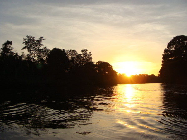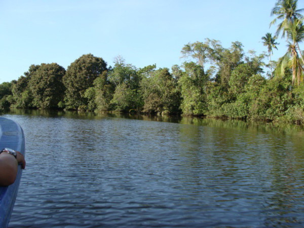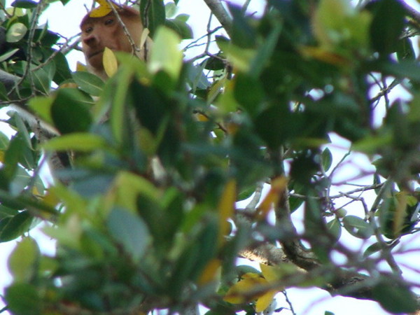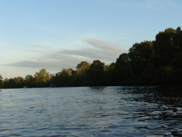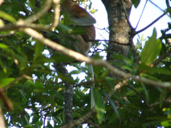 河岸兩旁都是高聳的原始森林,有時樹叢中會有騷動的聲響傳出 ,船家便會把船靠過去,試著尋找長尾猴的蹤影;有時調皮的猴子會 在樹梢上盪來盪去,然後一溜煙的消失在樹叢中。船家為了讓我們不 虛此行,甚至會把船開進河道支流,造成船身擱淺,還需其他船友前 往營救。不過在河道上來回穿梭,還是見著了長尾猴的模樣。