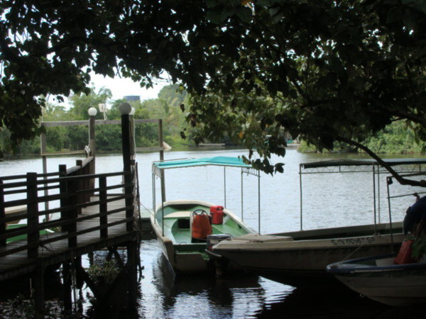 下午要到很遠的地方,尋找長尾猴的棲身之處,搭了車子行經大 小村落,終於來到一條河流旁的船嵨,一群人先在船嵨內享用了道地 的下午茶(糯米做的小甜點),然後依序搭上小船,在船家的掌舵下 ,滑入河道,沿著不算小的河道一路前行。