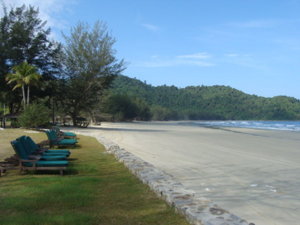 用完餐後,決定到沙灘做日光浴,於是回房間換上泳衣,就來到 一片平坦的沙灘,挑了張沙灘椅後,便往碧藍的海水衝去,或打水仗 ,或踢水花,或築沙堆,好像一群無憂無慮的小朋友,盡情的嬉鬧。