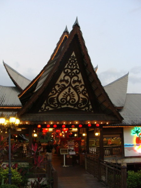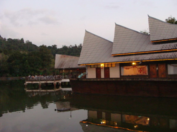 在沙巴的最後一餐,前往一家占地很廣,裝潢富麗,賓客往來頻 繁的特色餐廳,餐廳位於山邊的水塘上,水塘中有一獨立舞台,專為 用餐時表演傳統舞蹈、戲劇的演員而設。為了避開用餐人潮,我們提 早了時間,誰知用完餐,要離開時,停車場滿滿的轎車,為了找到我 們的專車,就花了許多時間。