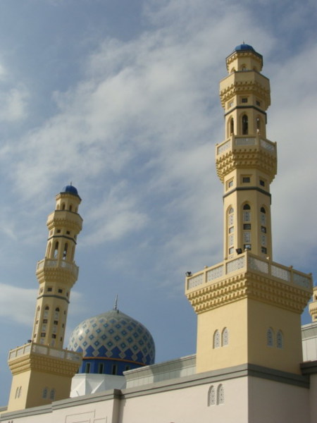 這是由一個藍色圓頂和四隻鵝黃色的長柱體所組合而成的建築 ,在藍天下顯得肅穆與莊嚴,其面積很廣闊,除了主建築外還有寬大 的廣場和護城河。寺裡寺外總看到有人在打掃,怪不得整座清真寺好 像一塵不染似的。