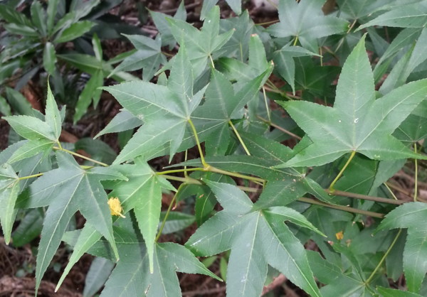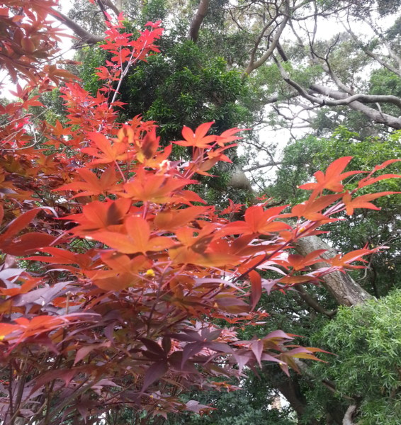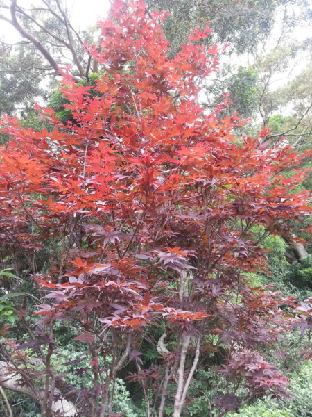 坐在農舍前,欣賞著四周的景致,才開始注意眼前 的一團火紅,原來是一棵長滿紅葉的槭樹,在一片綠蔭 中顯得特別引人注意,而現在才進入夏天,為何它已穿 上紅衣,詢問之後才知它一年四季都只穿著紅衣,應是 品種不同之故,否則它身旁不遠處,也有一株楓樹便全 身依舊深綠,安分的站在相思樹林腳下。