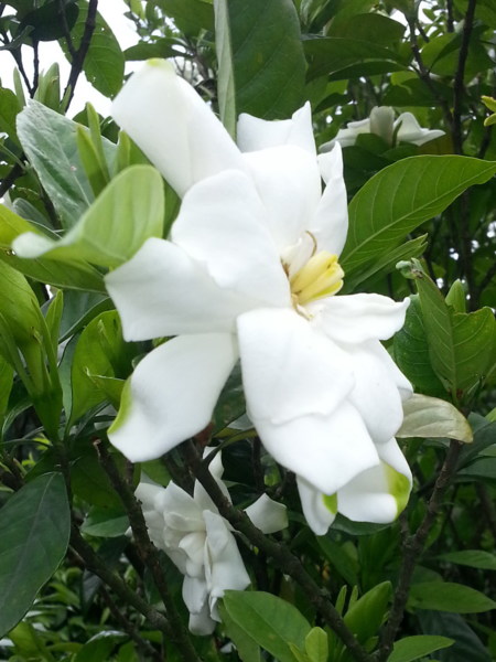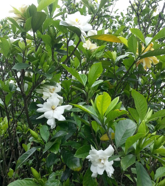 終於打包秤種好了,我是今天的冠軍,總共裝了兩 大箱。任務完成,大夥決議上陽明山賞花、用餐。正好 可以從北投開車上山,這條路對我而言是再熟悉不過了 ,所以很快的就到了竹子湖的餐廳,一看餐廳門口停滿 了車,原以為要等好久了,沒想到竟然很快就有位子了 。等待的時間我總是無法安靜的坐著,我四處參觀餐廳 的庭園設計,發現一棵好大的梔子花樹,空氣裡飄著淡 淡的花香,令我心曠神怡;