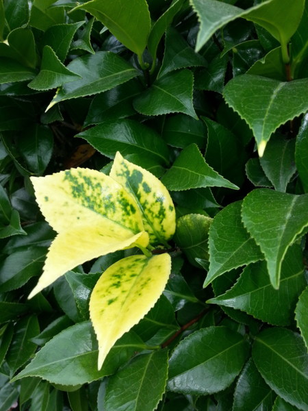我還發現了一顆修剪得很整齊的榕樹叢中長出了不 同顏色的葉片,看起來十分突兀卻有著衝突的美感。