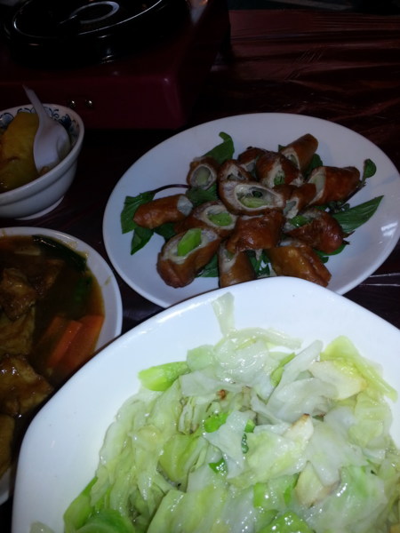 炸肥腸也是一道佳餚,肥腸炸得表面酥脆無比,但 裡層還是軟嫩彈牙,咬起來也不會有怪異味道;涼拌洋 蔥更是夏日必備開胃菜,切絲後經過特別調味料調味後 ,吃起來沒有洋蔥原有的刺鼻辛辣味,取而代之的是想 多扒幾口飯的感覺。我們五個人一下子就把桌上的菜餚 一掃而空。