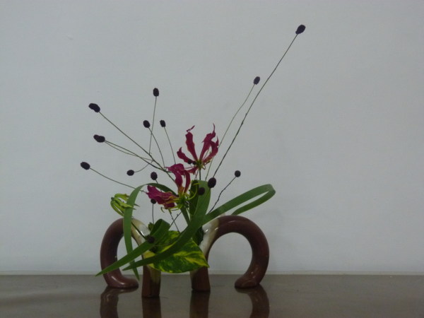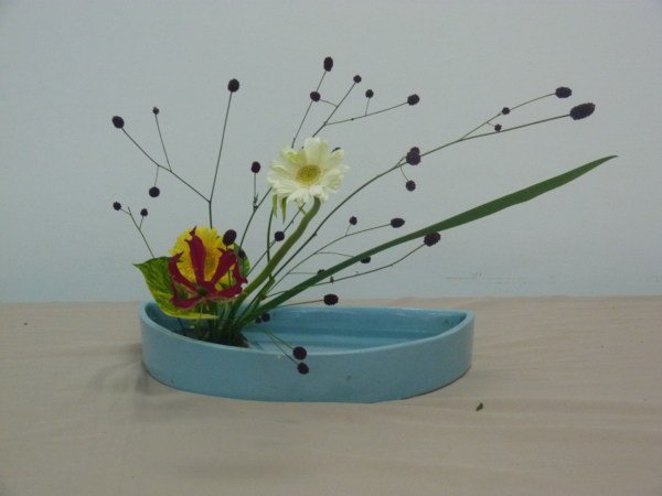 花材:吾亦紅2支 黃白太陽花各一支 青龍葉一棵 火焰百合一支