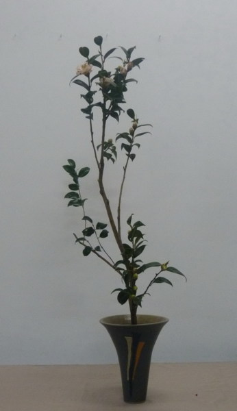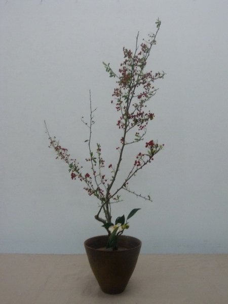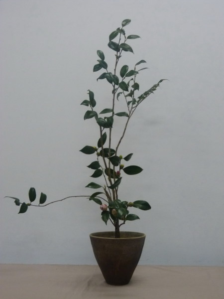 插法: (一)依狀元紅的姿型,選擇陰陽方後,再加以修剪 成為有用的役枝,真、副之間強弱區分清楚,補枝的必要 性,注意生花的精髓事「枝少意義深」。 (二)柔軟的枝條可以「流枝」的變化,上或中段留 枝,原有役枝須補上「座」。 (三)茶花的體,花苞大中小的配置注意葉子的陰陽 面。 (四)完成作品的氛圍要讓觀賞者有所感動即是佳作。