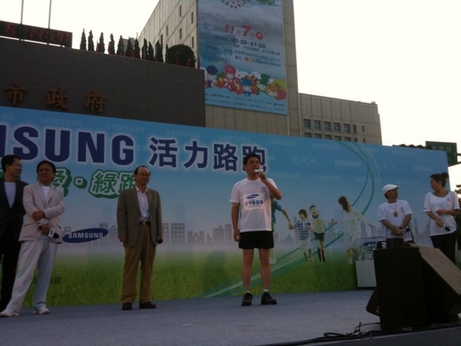 已經連續辦了五年的三星活力路跑,今年以"Go Green 愛,綠跑"為主題, 今天早上七點鐘在市政府前廣場開跑, 我也去參加了! 領了一件免費贈送的排汗衫與乾洗手的清潔液,雖然只有短短的三公里,但是參加的民眾還不少,或許多少也為了免費的禮物吧! 這家企業還挺大手筆的,跑完之後,還有許多獎項抽獎,也有一些表演節目,第一個節目就是前兩天在金鐘獎中表演的"大小姐",兩位小妹妹,分別才6歲與8歲,上台一點都不怕,落落大方,而且笑容非常的燦爛! 真的可愛極了! 另外還有山寨版的Sorry sorry 舞蹈表演, 上台的舞者都非常賣力的展現自己的才藝. 今年最年長的參加者, 是一位高齡95歲的爺爺! 說實在的,如果他不說,看起來頂多像70多歲,希望自己未來也能如此的健康,他的特點是常保開心與多運動,最年輕的參加者,是一個才一歲一個月大的小妹妹,據說她也走了部分的路程,真是驚人! 看了幾個節目,實在站的腳酸,心想自己也很少會幸運中獎,就先溜走了!今天的路跑是給自己暖暖身,下周還有NIKE的百萬人路跑!