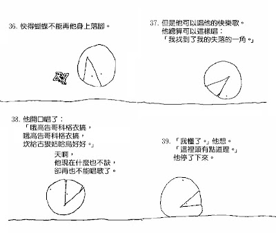 失落的一角 "THE MISSING PIECE" 這是一篇以簡鍊生動的線條和文字,闡述一則有關「完美」和「缺陷」的寓言。