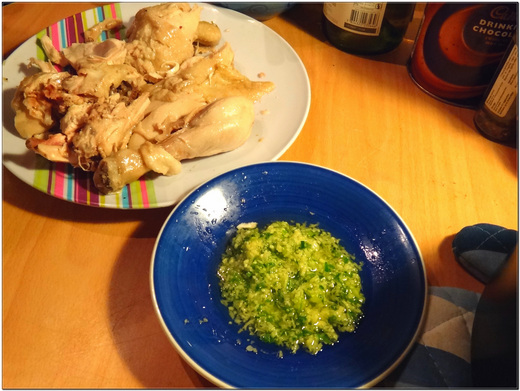放學回來,看到一隻北拋拋、玉米米的全雞,晾在室外攝氏五度的窗台上。吹風?爸爸閃著神秘眼神說,醬料已經作好了,等剁好雞,準備開飯。 哇!綠油油的蔥油醬,如經過絞拌機的細碎刀工,媽媽立刻質疑,怎麼可能是爸爸做的。軟嫩的白斬雞,沾上鹽味適中的蔥油醬,在台灣的燒臘店都不見得吃得到,單單這道菜就可以吃二碗飯。 原來,今天教會的阿祥叔叔有事找爸爸,他是廚師,教爸爸做白斬雞,大火煮滾後,再用中小火煮廿分鐘,即把整隻雞撈起來,放涼至少廿分鐘,是雞肉軟嫩的密訣,這就是為什麼那隻雞會被放在窗台邊的原因。阿祥叔叔好人做到底,還幫爸爸做蔥油醬,他快刀切好整碗的蔥碎與薑末,淋上燒熱的橄欖油,拌入二小匙鹽,即是蔥油醬。 爸爸忘了告訴阿祥叔叔,其實在台灣吃白斬雞是蘸蒜末醬油,蘸蔥油醬是港式吃法,沒有錯,阿祥叔叔是來自澳門的廚師。如果是煮好的雞肉,用熱油淋上蔥絲,台灣叫蔥油雞。不管叫什麼名字,這碗蔥油醬,在下午五點即天黑的英國來說,是室內最好的風景。 |