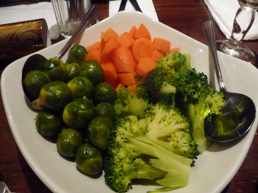 seasonal vegetables. 主菜:都有附烤馬鈴薯,一個長的,一個扁的,還有一片炸地瓜。