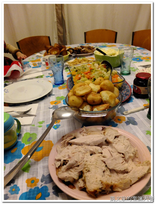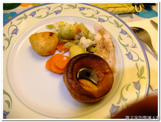 教會惠芬阿姨邀請我們到他家享受英國的經典聖誕大餐─火雞大餐。她的先生KEVIN是英國人,由他下廚預備。 哇!滿桌的菜餚,我們遵從惠芬阿姨家的傳統,手牽著手禱告。烤火雞是主菜,搭配cranburry醬,主食則是roasted potatos, Mashed potatos,以及Uncle Kevin最喜歡的yorkshire pudding。烤馬鈴薯外皮酥脆,加了奶油調味的馬鈴薯泥,濃香有味,約克夏布丁其實是一種中間凹進去的炸麵包,淋上烤火雞的肉汁。肉汁(gravy)在英國有罐頭,淋在馬鈴薯泥上也很好吃。 還有一大盤燙青菜,除了青花椰菜、紅蘿蔔,brussel baby sprouts甘藍球芽, swede蕪菁,在台灣都吃不到,蕪菁燙完吃起來還有點像地瓜。 特別的是parsnip歐洲蘿蔔,外型像白蘿蔔,有次我買來滷五花肉,但吃起來卻有一種青腥味,味道很怪,我發誓決不會再買,被它騙第二次。但Kevin把parsnip切絲,放進烤箱烤,再淋上肉汁調味,烤出來的外形像薯條,吃起來就像炸芋頭絲,很能接受了。 惠芬阿姨與Uncle Kevin輪流說著各自版本的初戀史,Uncle Kevin很難得的是,當他十八歲信耶穌時,就開始為他未來配偶要是基督徒來禱告,完全符合基督教的教導,但很少男生會照著做,認真禱告的人,上帝就賜給他愛他的女人。 聖誕餐的重頭戲是cracker─拉炮,這是我們覺得很新鮮的。我們手牽手拉炮,看誰拉到主炮,裡面有玩具。 惠芬阿姨家的耶誕大餐,與到大餐廳吃的一點也不遜色,雖然我們不太習慣馬鈴薯當主食,但是惠芬阿姨與uncle Kevin熱情招待,年少時最起初的愛戀,到現今四個都像明星的兒女,以及在耶穌基督裡的接待,真是讓我們體驗了英國寒冬中溫暖的耶誕大餐。