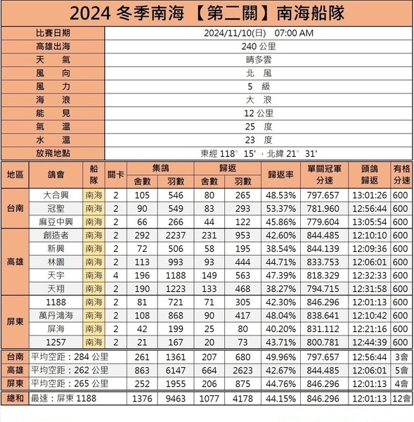 20241104冬季南海南北船隊第二關高雄港出海240公里歸返率成績資料