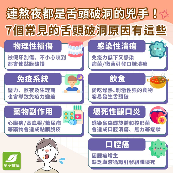 舌頭破的原因不少,舉凡不小心咬到、細菌感染、沒睡好、免疫力降低,都會害你嘴巴、舌頭破,而網路上也流傳抹鹽巴、塗西瓜霜可以幫助嘴巴、舌頭破復原,但其實這些偏方反而可能讓症狀更嚴重。到底舌頭破該怎麼辦?舌頭破可以吃與不能吃的食物有哪些?舌頭破的保養預防方法,以及該注意的疾病徵兆帶你一篇看懂! 目錄 嘴巴和舌頭破洞原因 舌頭破洞位置:舌下破洞、側邊破洞 嘴巴和舌頭破洞怎麼吃? 舌頭破洞怎麼快點好? 嘴巴和舌頭破洞飲食禁忌 舌頭破洞該看哪一科? 舌頭破如何緩解 舌頭破好不了當心口腔癌 舌頭破一定要觀察口腔白斑 嘴巴和舌頭破洞原因?是火氣大嗎?吃檳榔的影響? 其實嘴破、舌頭破洞是很常見的症狀,而造成嘴破或舌頭破洞症狀的原因有很多種,依據成因而有不同的預防、治療方式,日本牙科醫師丸山和弘表示,嘴巴破洞形成的機制目前醫界仍未能完全明白,一般認為與下列因素相關: 物理性損傷: 口腔受到外力傷害,如假牙、蛀牙、不小心咬到等,都會導致黏膜破損潰瘍,造成舌頭破。 感染性潰瘍: 病毒、細菌、黴菌、真菌感染導致口腔潰瘍。如果我們免疫力不好,就有可能因為這些病菌導致口腔潰瘍。 免疫系統: 這種嘴破常見於頰、唇、口底及舌頭等黏膜處,通常與個人體質、壓力、熬夜及女性月經前的荷爾蒙變化相關,持續約1~2星期。 飲食: 體質敏感者,攝取代糖、小麥或麩質食物後容易發生口腔潰瘍。缺乏維生素C、B12 或貧血患者也容易產生口腔潰瘍。愛吃火烤、油炸、辛辣等燥熱、刺激性強的食物,也容易火氣大,造成嘴破。 藥物副作用: 心臟病、高血壓、糖尿病或精神科藥物會影響唾液分泌,造成黏膜脫皮、口乾舌燥。 壞死性齦口炎: 壞死性齦口炎比較少見,是由奮森螺旋體和梭形菌感染所造成的,可能會因為營養不良、口腔衛生不佳而加重病情,造成全身無力、發熱、牙齦出血、牙齒鬆動、強烈口臭、槽骨暴露、牙齒脫落等症狀。 口腔癌: 因腫瘤增生,缺乏血液循環引發組識壞死,最後呈現潰瘍。口腔癌泛指口腔內的所有惡性腫瘤,成因是口腔黏膜長期受到刺激使細胞變異,如抽菸、吃檳榔、喝酒、口腔衛生不良、咬合不正、蛀牙反覆造成傷口、太辣、太熱的食物,都有可能使口腔黏膜過度受到刺激。 舌頭破洞位置:舌下破洞、側邊破洞 從中醫角度來看,舌頭破洞位置不同,也代表不同的問題,例如舌頭側邊破洞多半是因為咬傷、硬物劃傷造成,或是因為感染、過敏或其他因素引起舌炎所致;如果是舌下破洞就要分外留意,如果舌下破洞久久不癒合、且有疼痛、舌頭運動與知覺受限或吞嚥困難等症狀,就要小心可能是嚴重的口腔癌症。 嘴巴和舌頭破洞可以吃什麼?喝什麼?有什麼禁忌? 舌頭破洞吃什麼、喝什麼才會好得快呢?其實除了一些疾病、外傷造成的嘴破以外,一般常見的嘴破不妨透過補充以下營養素來改善、預防復發: 鐵質:肉類、肝臟、大豆、馬鈴薯、牡蠣、米、燕麥、無花果、黑麥、杏仁、雞蛋、南瓜等。 葉酸:肉類、肝臟、腰子、萵苣、菠菜、番茄、紅蘿蔔、花椰菜、油菜、小白菜、蘑菇、葡萄、草莓、梨子等。 維生素C:奇異果、柳橙、葡萄柚、香蕉、檸檬、鳳梨、木瓜、芒果、蕃茄、蘋果等。 維生素B12:肝臟、牡蠣、秋刀魚、海瓜子、蜆、雞蛋、牛奶、優格、乳酪等。 舌頭破洞後,常聽說多吃奇異果和抹西瓜霜、鹽巴?這樣有效嗎?怎麼可以快點好? 舌頭破洞時多吃奇異果會好很快?網路甚至流傳只要吃到第5顆奇異果就會發現潰瘍不知不覺好了?然而,衛福部食藥署闢謠專區澄清,「一天吃5顆以上奇異果可治療口瘡」並無相關科學論述證實!事實上奇異果富含的維生素C的確能幫助修復黏膜,不過舌頭破或嘴破的原因很多,且也可能是口腔黏膜念珠菌等口腔黏膜病變造成的,萬一口腔潰瘍情形嚴重,狂吃富含「酵素」的奇異果或鳳梨,有可能加重黏膜破損,後續更難以痊癒。 另外還有像是在舌頭破上塗鹽巴的偏方,或是利用鳳梨「咬舌頭」的特性以毒攻毒,但這樣不僅對傷口復原沒有幫助,反而會讓患部受到刺激、增加感染的風險,而坊間也很受歡迎的西瓜霜,則是一種含有多種中藥的複合物,品質難以控制,還是建議舌頭破後讓醫師判斷症狀並對症下藥,才有機會加速康復。 嘴破、舌頭破不能吃什麼?嘴破禁忌飲食! 攝氏70度以上的熱食:熱開水、熱湯等太燙的食物或飲料。 油炸食物:鹽酥雞、需要很多油來煎的魚等,一般來說台菜大多偏油,外食者要特別注意。 辛辣食物:辣椒、胡椒等刺激性食物。 舌頭破洞怎麼辦?該看哪一科?服用什麼藥?怎麼治療? 發生舌頭破的症狀時,只要三餐正常、睡眠充足,大約1~2周會自然癒合,治療舌頭破的關鍵是趁破洞還小的時候趕緊治療,可以請醫師開抗菌軟膏等治療嘴破用藥,大概2~3天就會癒合,看診時也能讓專業醫師判斷嘴破的成因,避免誤判病情。 如果嘴巴、舌頭破洞破皮想去看醫生,要掛哪一科?一般來說,舌頭破可以去看牙科或耳鼻喉科,醫師可用口內膏來改善,但若是問題比較嚴重的潰瘍,醫師可能會在病灶上點上硝酸銀,對組織產生燒灼的作用,加速傷口癒合。 另外一種能幫助傷口癒合的藥品是主成份為聚甲酚磺醛的濃縮液,這種濃縮液可以選擇性作用在病變組織,使之凝結、易於排除,但不會影響正常鱗狀上皮細胞。但每個人舌頭破的原因並不相同,若口腔黏病變是
