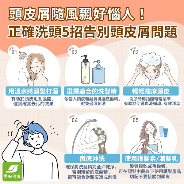 用溫水將頭髮打溼:如果洗頭的水溫太燙,可能會刺激頭皮,造成頭皮容易乾癢、髮根變得脆弱等,建議用溫水洗頭,一樣能夠幫助頭皮毛孔張開、確實去除髒污。 選擇適合的洗髮精:依照個人頭皮和髮質情況挑選洗髮精,才能避免過度刺激。 輕輕按摩頭皮:洗頭時不要用指尖、指甲去抓撓頭皮,而是要用指腹輕輕按摩,有助於促進血液循環、有效清潔。 徹底沖洗:沖洗頭髮時,一定要確保將洗髮精完全沖乾淨,一旦殘留洗髮精在頭髮上,就很可能會造成頭皮受刺激或髮質變差。 使用護髮素、潤髮乳:髮質較乾或毛躁問題嚴重的人,在洗髮後可以使用少量護髮素或潤髮乳,針對頭髮中斷到髮尾部分進行保濕,切記不要接觸到頭皮,否則護髮素和潤髮乳的油脂可能會阻塞毛孔,造成頭皮健康亮紅燈。