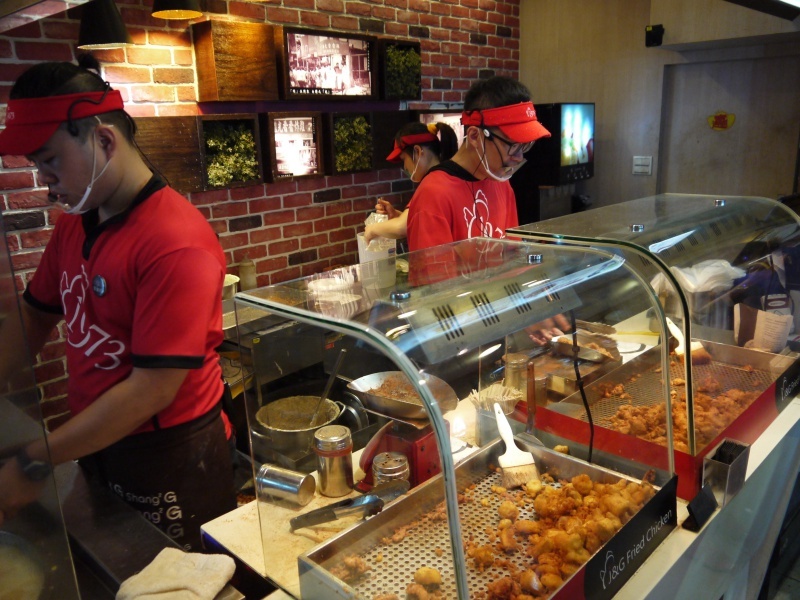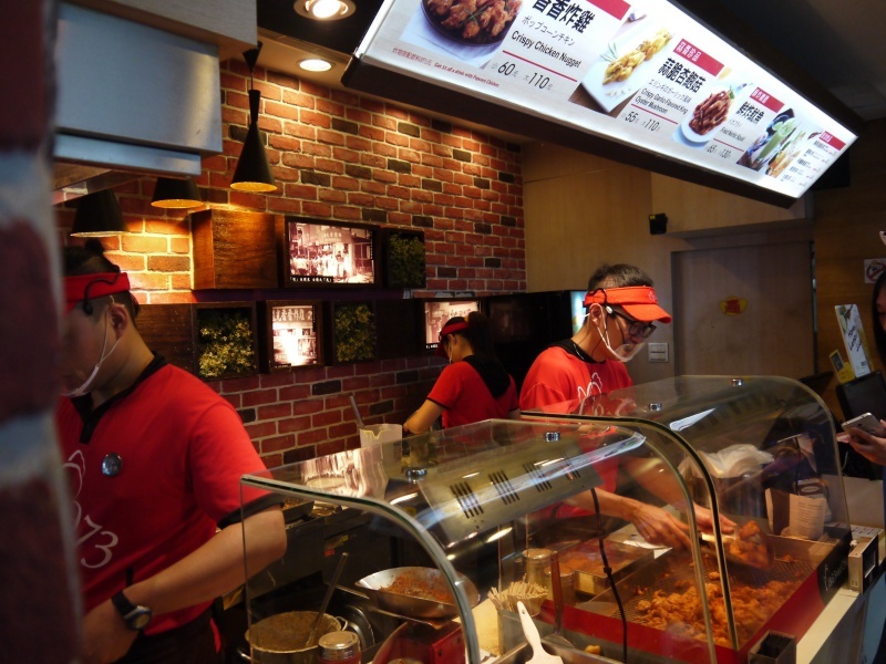 店內三名員工非常認真地出餐中! 照片中最左邊的這位,非常有趣,一邊炸著炸雞一邊念念有詞的推薦大家吃炸雞,有客人跟他說他非常可愛!我想在服務業工作,能聽到客人稱讚自己應該是相當開心的一件事情吧!
