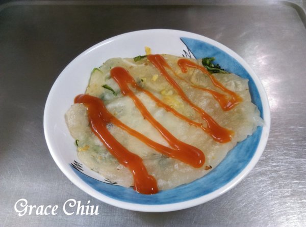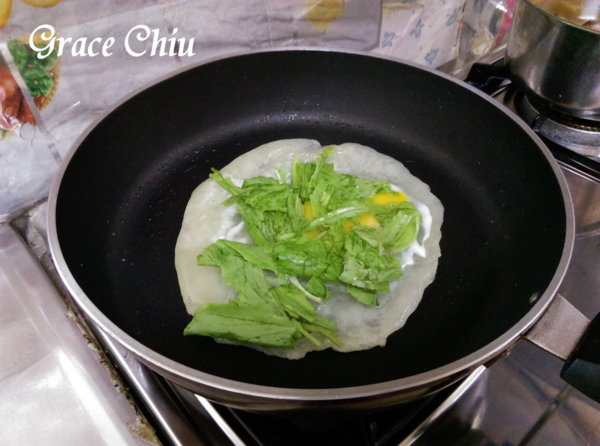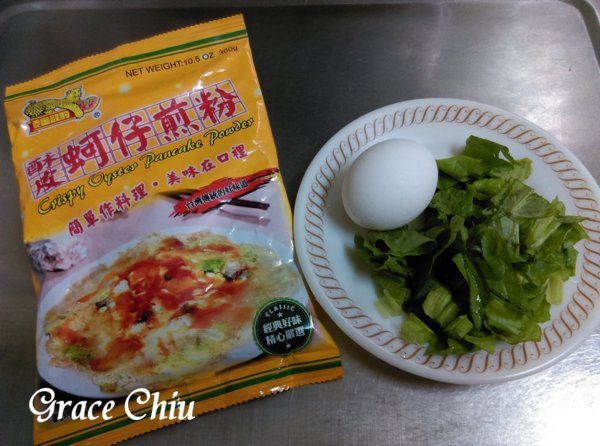 做法很簡單,就是備好材料(蚵仔/蝦仁等.青菜.蛋)跟調好的粉漿水,照著包裝上的做法教學,如果有蚵仔或蝦仁等食材先以熱油煎到約七分熟>之後加入粉漿水待成型>打顆蛋抹開&加入青菜>待青菜熟後翻面再煎約二分鐘>完成.