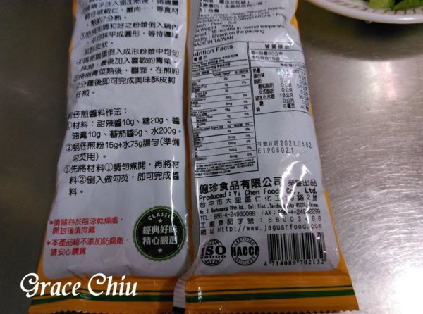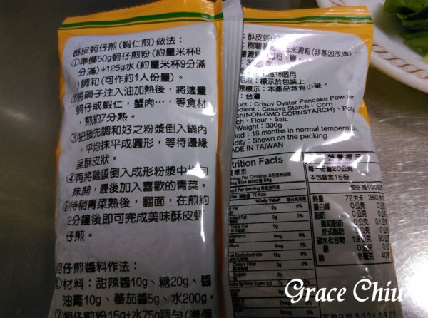 包裝背面有做法教學,連醬料的做法也貼心的附上,酥皮蚵仔煎粉一包300g,依照做法教學的建議量一人份(50g),也就是一包約可做六份的蚵仔煎.