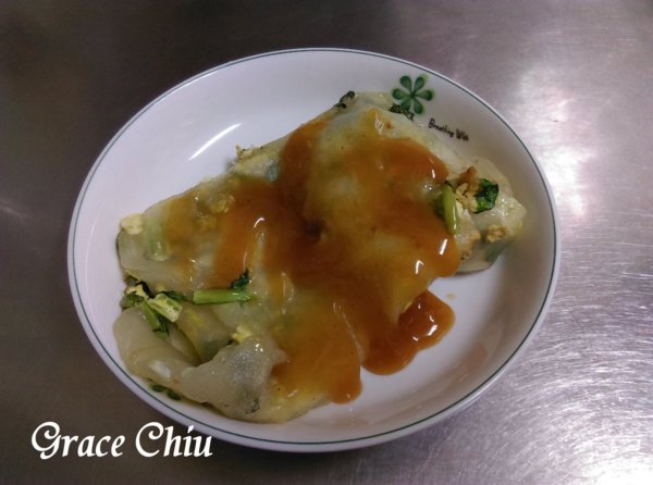 QQ又帶點微酥的蛋煎完成!好像要另一面朝上比較有蛋煎畫面,這樣看起來好像蔥油餅,哈哈~不想花時間調醬的社團上也有推薦萬家香海山醬(我今天的醬就是用這罐).