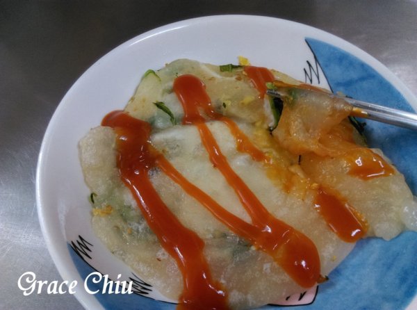 ───────────────── 昨天丫母買菜回來很開心的說:我買了蚵仔回來給你中午做蚵仔煎歐!(丫母自己在那大心)...ㄝ~丫我就沒有很喜歡蚵仔啊!=..= 剩下近約一人份的粉漿,下午決定再把它煎成蛋煎