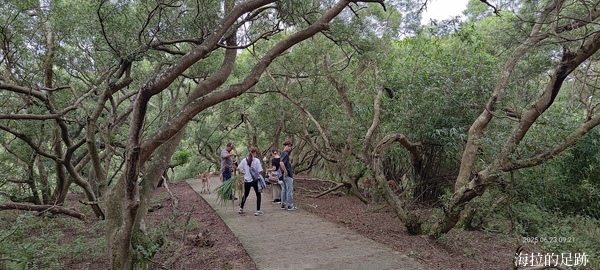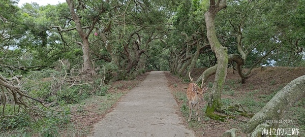 過了第二個涼亭後改走中央林蔭步道, 感覺從海洋進入森林中. 這裡也有一些鹿鹿在林子裡漫步, 海拉把手上剩下的桑葉都拿給鹿鹿吃, 但牠們很有個性喔. 先聞了下桑葉, 知道這上面有別的鹿鹿的口水就離我而去.