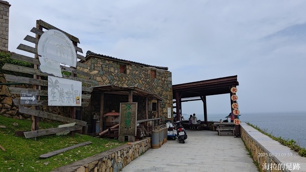 腿腳不好的人走到上圖的虎魚岬觀景台, 大約700公尺的路程, 可稍作休息, 欣賞過360度無敵海景後, 可考慮折返回碼頭旁的 “冰涼茶” 休息吃早茶. 它是島上唯一的店家, 販售各式點心、飲品, 價格落在50元~500元之間. 其中推薦必吃「手工地瓜年糕」, 季節限定的「馬蔥餅」以及「大坵燕窩」.