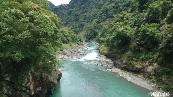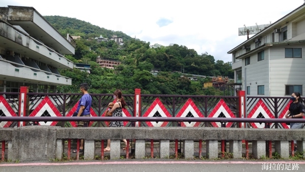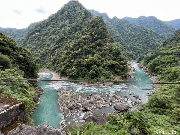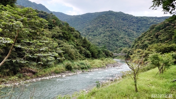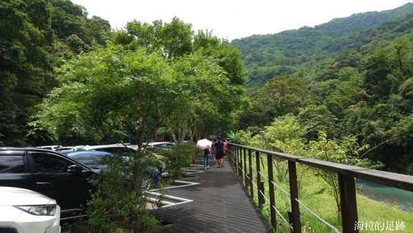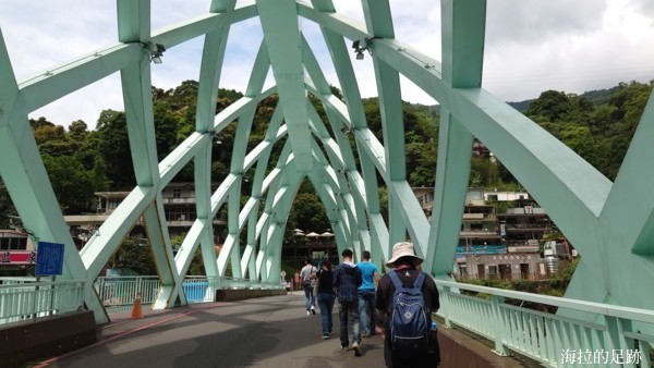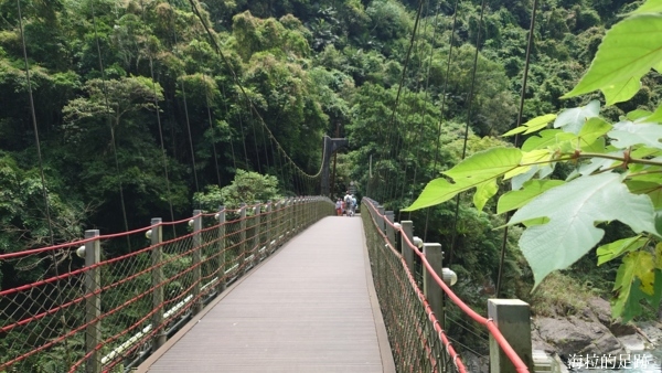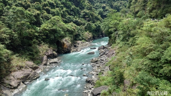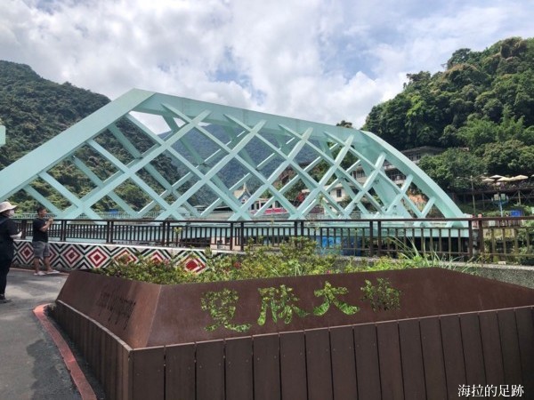 不會開車的海拉出遊若沒有朋友開車, 就只能依賴大眾運輸系統. 今日跟山友依舊先搭捷運在新店站會合, 然後再轉公車849到烏來公車總站. 849公車從台北車站發車, 每次到捷運新店站時總是人滿為患, 今天很幸運地我們五人圴有座位, 從捷運新店站到烏來公車總站, 車程約半小時. 下公車後依循指標往烏來老街的方向前進. 海拉以往到烏來的行程都是泡湯+美食, 自從開始爬山後, 3年前曾到內洞國家森林遊樂區散步兼觀瀑, 那時搭公車到烏來後, 再搭計程車到內洞. 這次挑戰較長的距離, 徒步來回烏來公車總站及內洞國家森林遊樂區, 順便收集健行筆記裡 “新北-臺灣百大必訪步道” 的寶石. 老街的商店大約早上10點左右才會開始營業, 我們在橋頭的便利商店補充水及糧食後, 穿過老街, 來到覽勝大橋. 覽勝大橋橫跨南勢溪, 站在橋上可以觀賞兩邊不同的溪景. 橋的兩邊橋面上還有透明玻璃, 可以直接看到橋下的風光.
