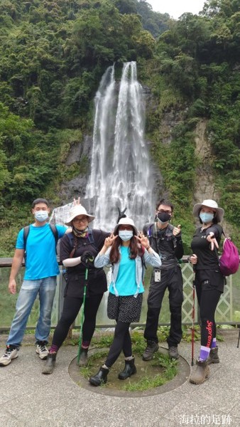 踢一小段馬路, 再走過情人步道沒多久來到與台車軌道並行的馬路, 前方就是台車終點烏來瀑布站, 這裡已經可以看到烏來瀑布. 我們來玩耍的前一週持續下了好幾天的雨, 所以很幸運地看到氣勢磅薄的烏來瀑布. 大家開心地在這裡拍了N多張照片後, 才心滿意足地繼續踢馬路. 今天大家好有默契, 不是黑就是藍. 是說登山建行穿著全身黑在大太陽底下行走粉熱吔~~ 學學泰雅勇士的穿著, 多麼涼爽舒適呀!